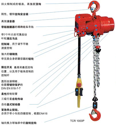 LIFTMASTER 型葫芦在6帕流动气压下可达到理论性能数据。但是它也可以在只有4到5帕气压下使用,在这种情况下提升速度将会降低20-30%。安全工作载荷(SWL)仍可以呗提升。TCR型系列产品的额定起重量根据需要可以从250公斤至100吨。所有的葫芦均拥有极高的性价比。他们的起重量和降速均可被调整并保护持续的工作。相对于手电门,控制链基至更容易一些,因为它就在主阀旁边。TCR型葫芦还可装配由防火花材料制成的环链和镀铜的吊钩。我们可以帮助您选择正确的配件。